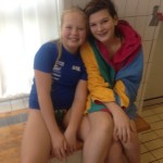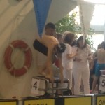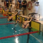 - Kaja R Johannessen ligger i vannet i bane 4 ferdig med sin 100 medley som ble flott gjennomført med ny pers. Klar på pallen står Heat 5 på 100m medley står Julie Fatnes bane 2 og Ida B Olsen i bane 3.
